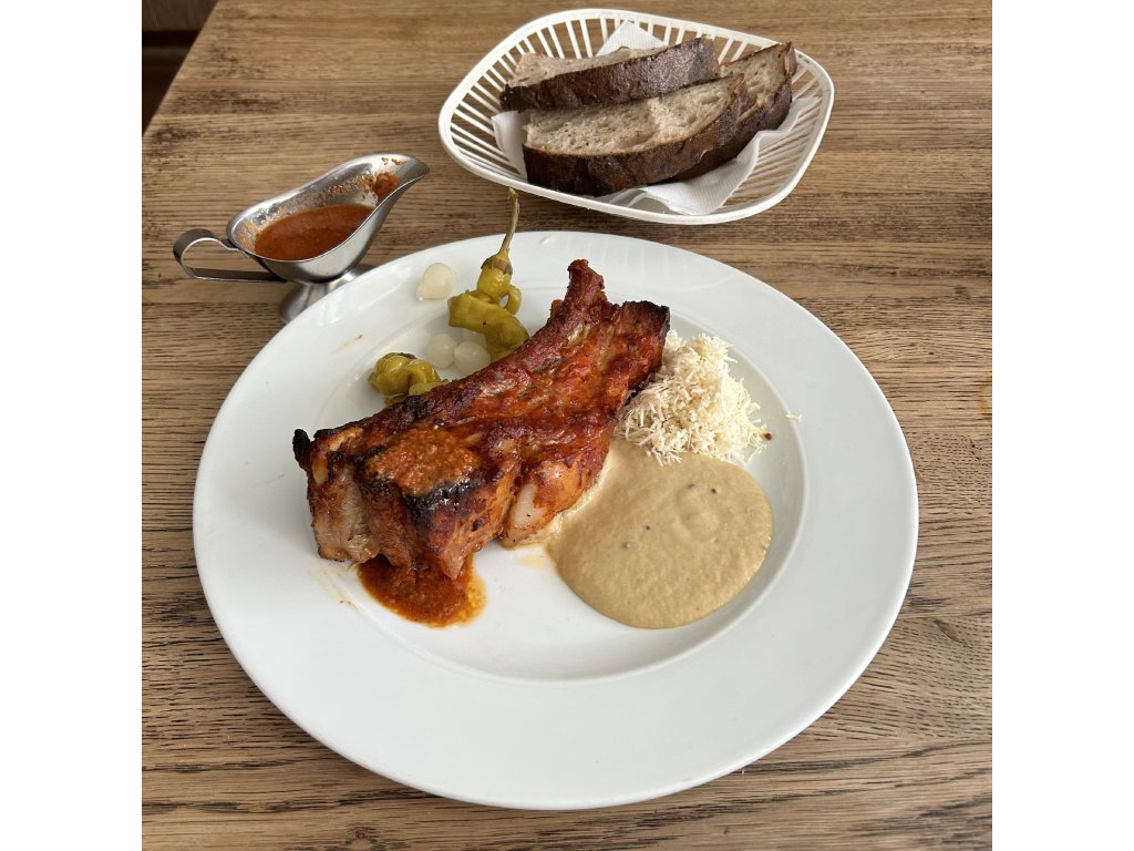 Pečená vepřová žebra na pivu s hořčicí a čerstvým křenem, chléb z Esky
